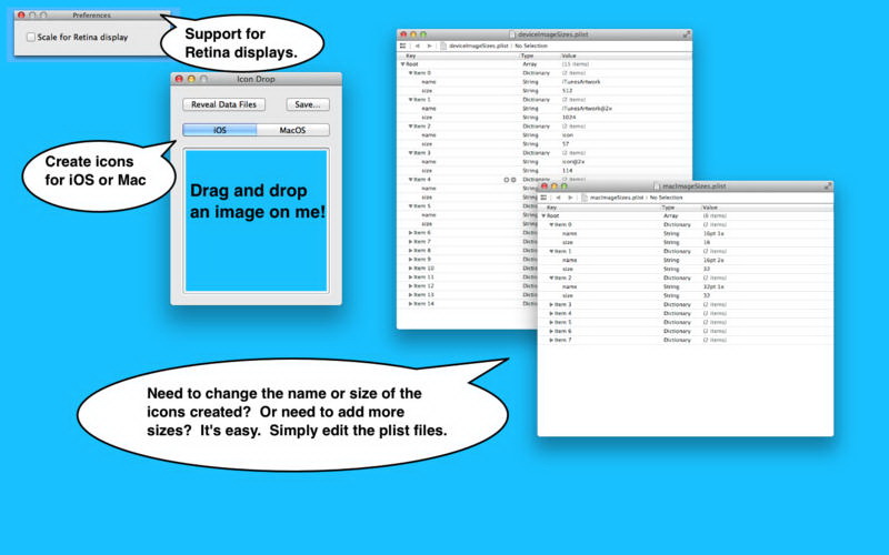 different sizes and names. Icon Drop provides property list
